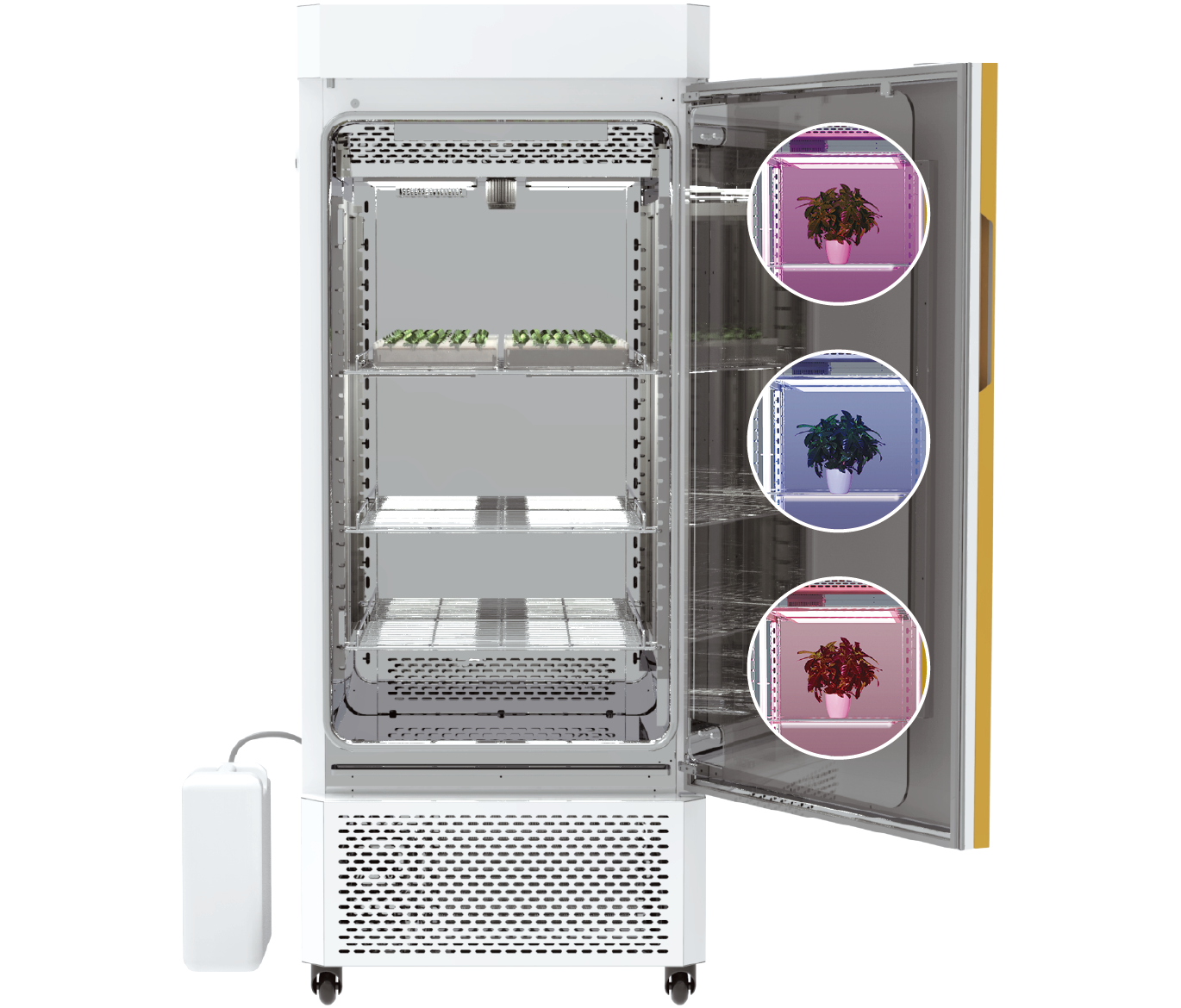 3、可調光譜照明系統:內置四色LED光源,波段包含白光400-700nm、紅光波長660nm、藍光波長450nm、紅外光波長730nm,可獨立調節每種顏色LED光源的光強,獲得不同的光譜組合(1004種),滿足植物不同階段對光的需求。